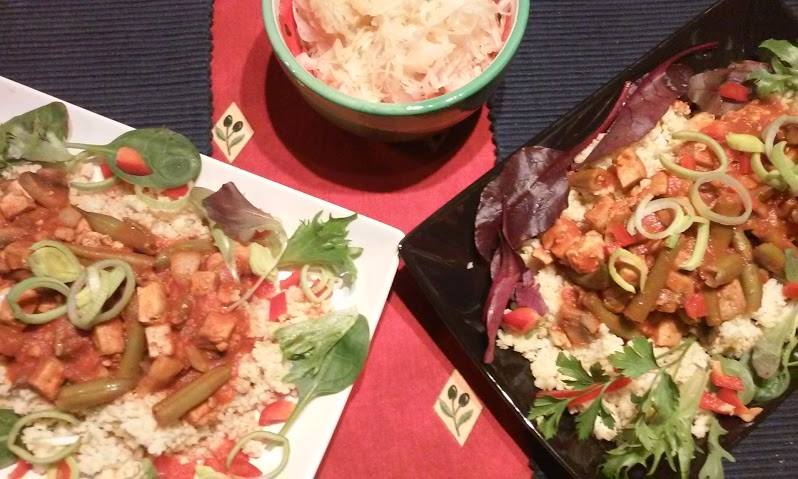 A közben szépen bedagad, kölessel megágyazok a pirított tofumnak, megszórom a tetejét a maradék felkarikázott póréval és egy kis petrezselyemmel. És bele is merülhetünk a gasztronómiai élvezetbe!