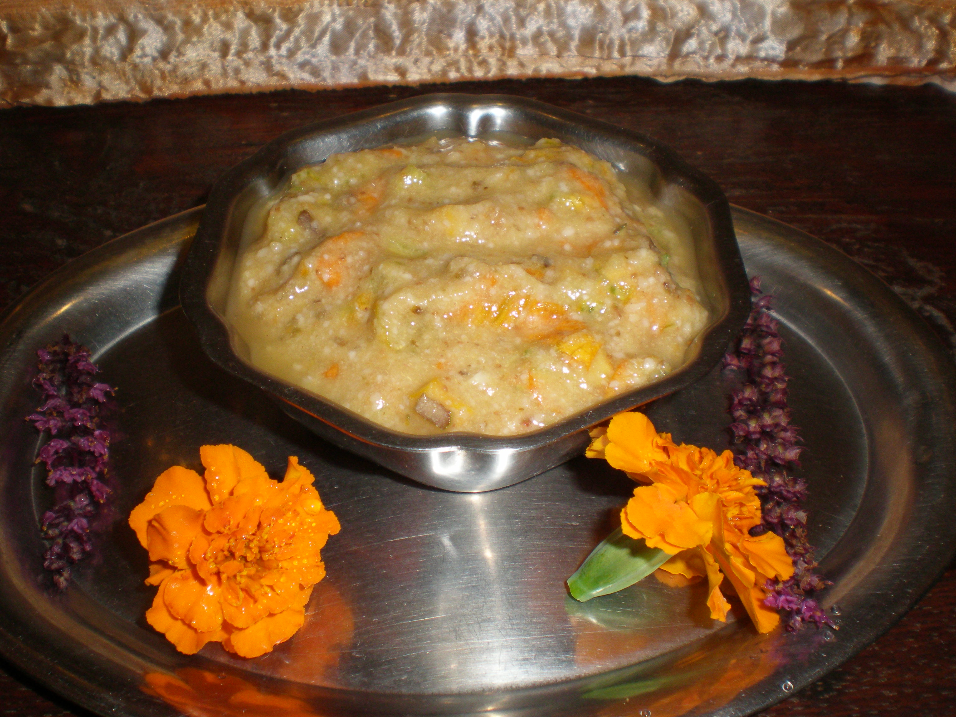minden szépen megtisztítasz, mert a mondás szerint: A tisztaság az, ami legközelebb van Istenhez – mindent alaposan összepépesítesz a cukkini virágok kivételével – ezeket apróra vágod - hozzá teszed a mandula lisztjével a többi szerencsés alkotóval – boldog hangulatban készre alkotod – hálát adsz a Legfőbb Fűszermesternek, hogy alapanyagot és képességet adott, hogy valamire képes lehessél - kínáld meg szeretteidet.