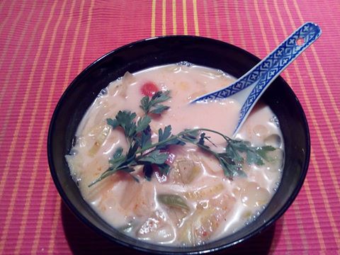 Aztán felteszek egy ¾ kondérnyi vizet forrani. Beledobok nagyjából 6 darab lime levelet, egy kis mokkáskanálnyi galangát és mellé kerül még az ázsiai citromfű is. Ha szálas akkor ,az az egy vékonyabb friss szár, ha por akkor egy fél mokkáskanálnyi. Aztán amikor elkezd forrani a víz, már engedem is bele a szépen felszálazott zöldségeimet. A paradicsomot szinte csak a végén teszem bele. Ízlés szerint sózom. Majd , mikor már majdnem megfőttek a zöldségek, beleteszem a rizstésztát, 2-3 percet még adok nekik együtt zubogni. Ezután tűzről levéve, beleöntöm a kókusztejszínt jól elkeverem, hozzászórom a felszálazott pritamint, és a friss koriandert. Ha netán van még otthon egy kis póréhagyma azzal is fel tudjuk dobni még a szép színeket. Majd pedig fedő vissza a kondérra és hagyom, hogy a tészta teljesen bepuhuljon. Tálalásnál én szeretek beletenni egy kis csipős paprikát is és egy hangyányi lime lével is még pikánsabbá tehetjük. S ezt a fejedelmi levest még meg lehet koronázni egy kis mangós-banános-ananász turmixszal.