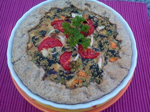 Aztán már terelgetem is bele ezt a masszát a formába. A plusz peremet, amivel nagyobbra nyújtottuk a tésztát, most használjuk fel, ezzel takarjuk be a kisünk szélét. Szépen visszahatjuk a túlnyúló peremet a töltelékre, majd én még tettem a tetejére díszítésképp paradicsom karikákat, és póréhagymát ééés már mehet is a forró sütőnkbe! Nagyjából 25-35 perc kell, hogy elkészüljön.